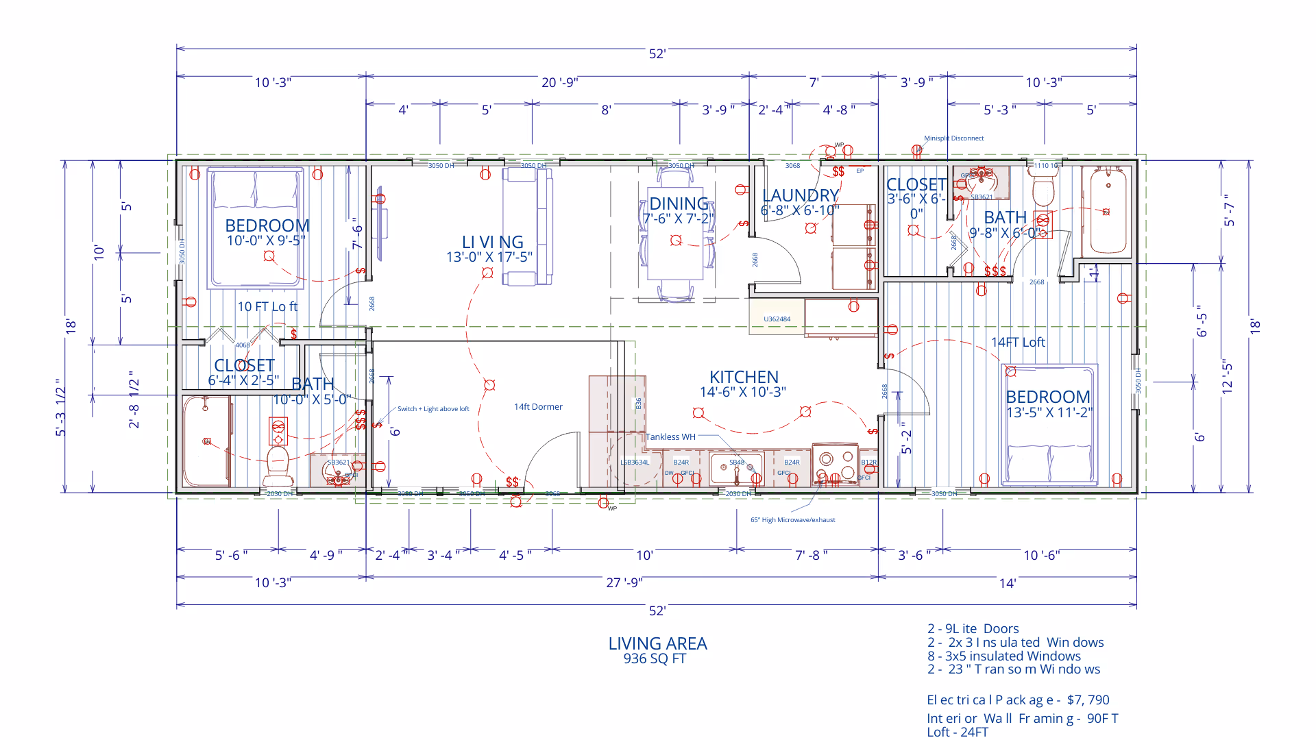 This 18x52 cabin shell floor plan features a well-balanced two-bedroom, two-bathroom layout with separate living, dining, and kitchen areas. Added laundry space and loft areas increase functionality, while the open center living space with dormer makes it ideal for full-time living.