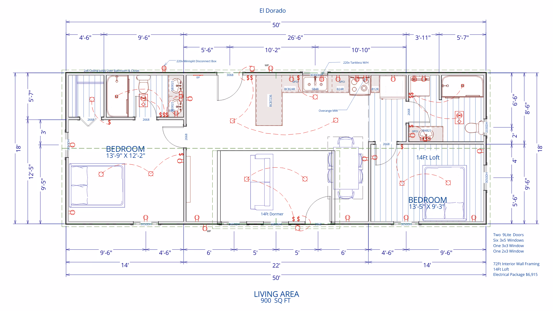 This basic two-bedroom cabin shell floor plan offers a practical layout with two bedrooms, two bathrooms, and a central living and kitchen area. The design provides good separation between sleeping spaces while keeping the main living area open, functional, and easy to customize for everyday living.