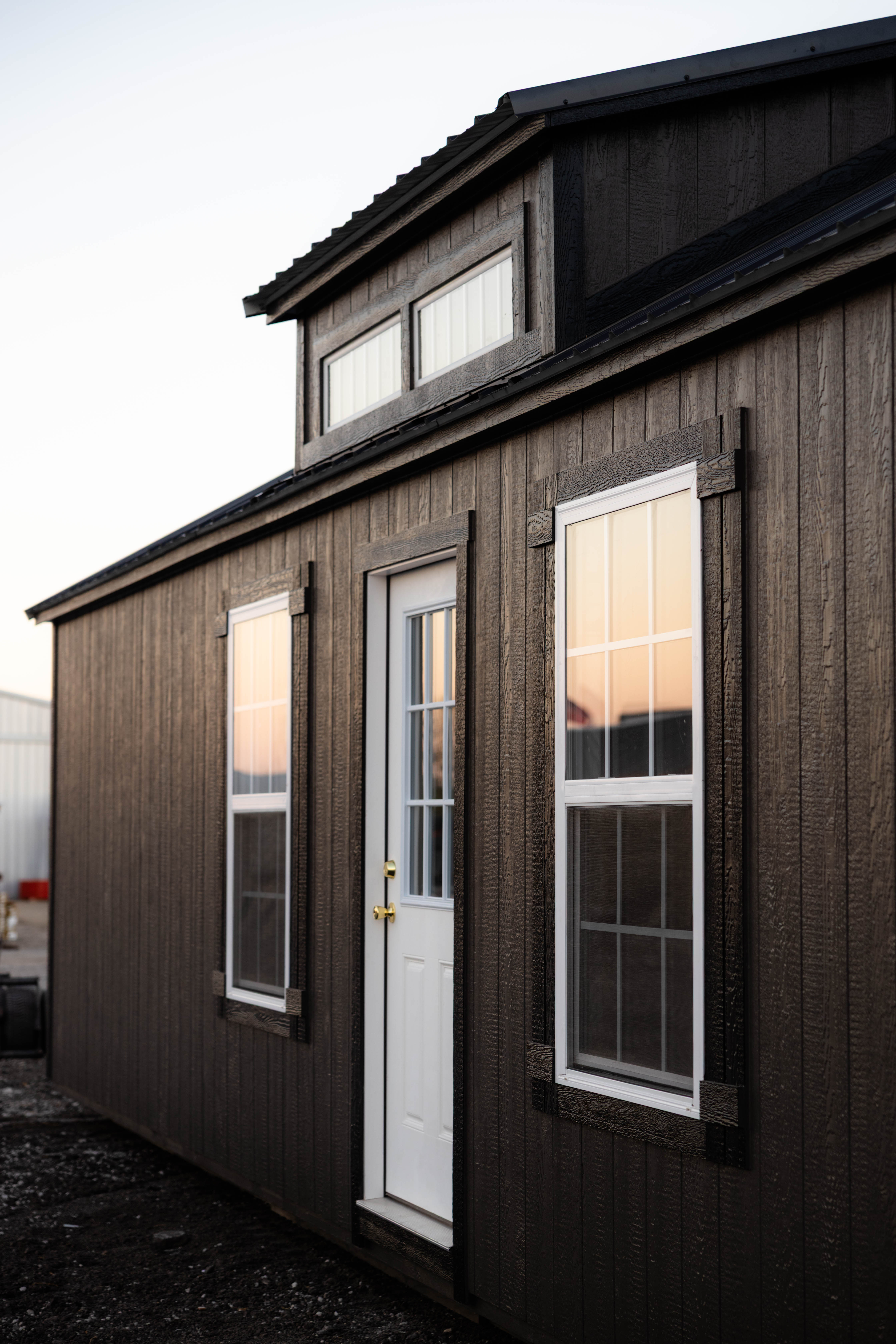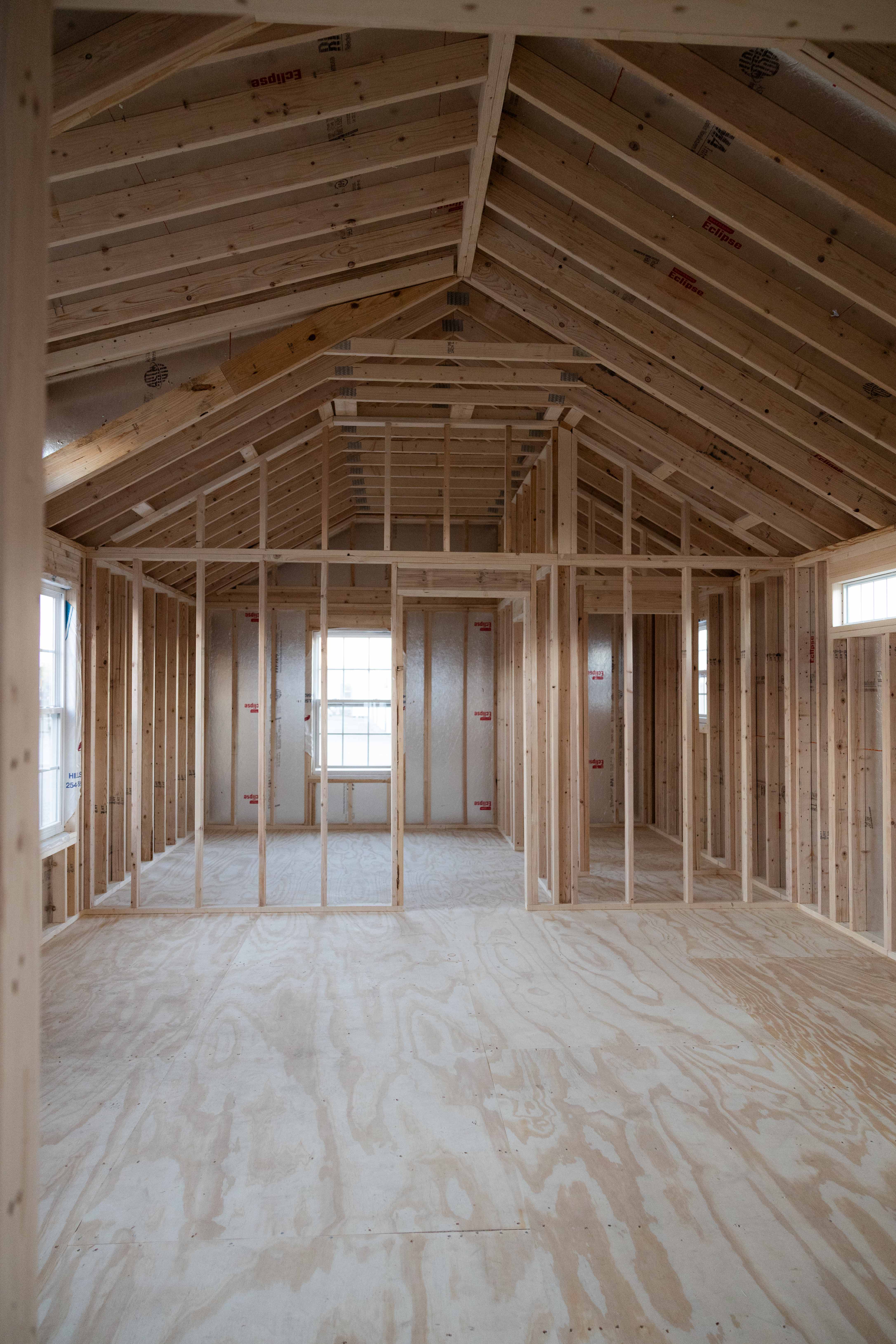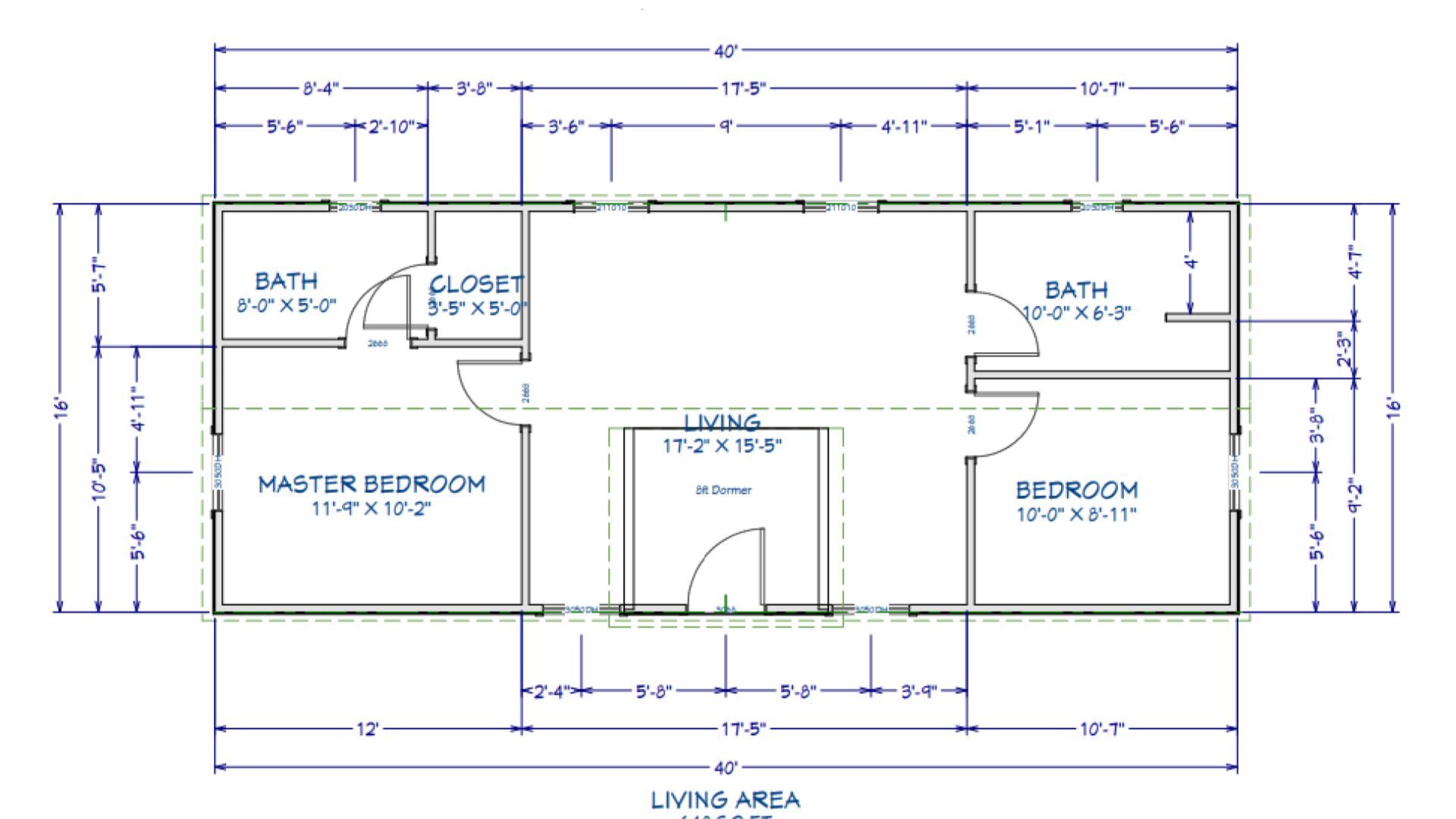 This 16x40 cabin shell is designed with a simple yet highly functional layout, featuring interior wall framing for two bedrooms and two bathrooms. An 8ft dormer centered on the roof adds natural light and headroom, giving the space an open, comfortable feel. With a clean exterior and practical floor plan, this cabin shell is a great foundation for a well-planned home or getaway.