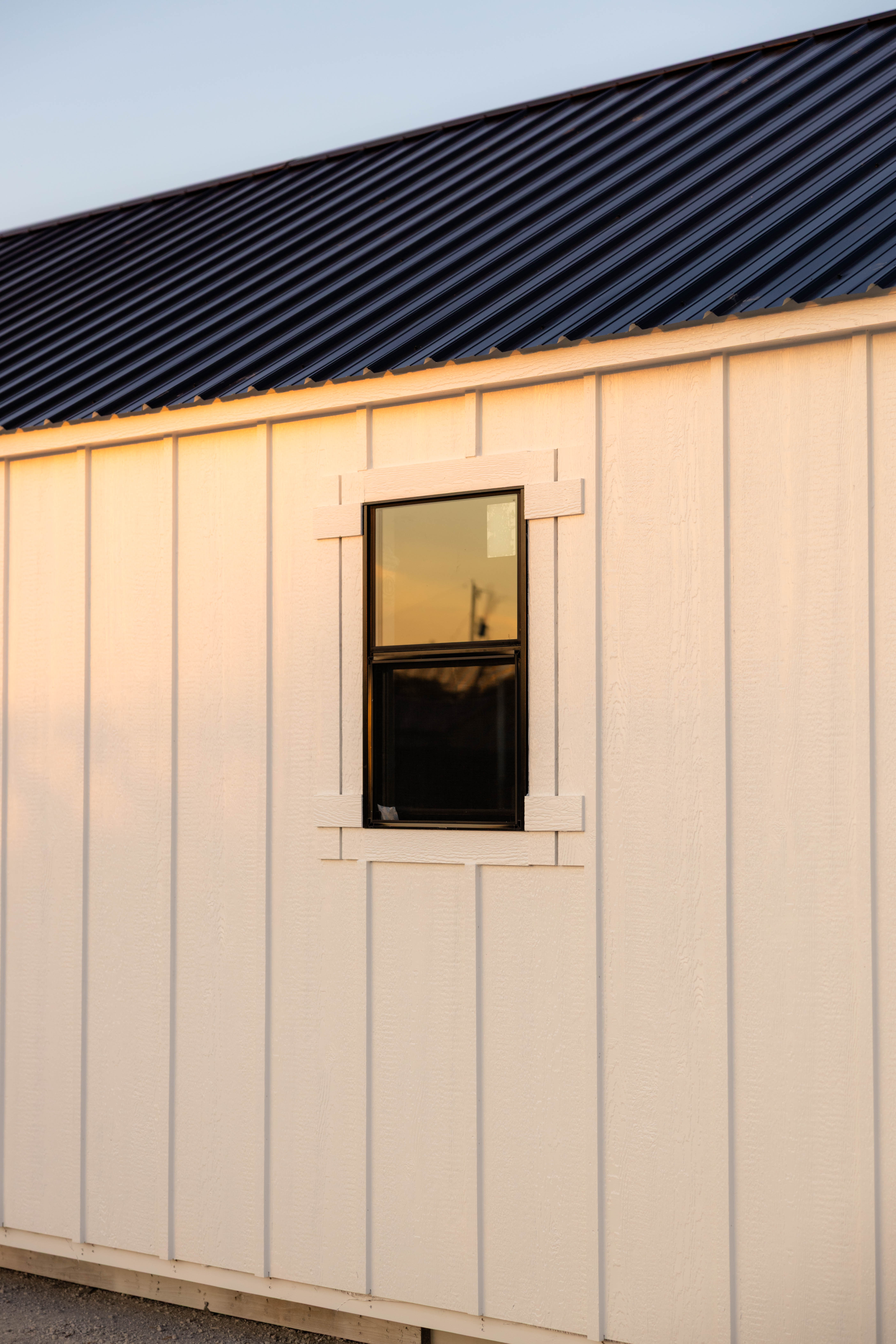 This 18x32 cabin shell offers a modern cottage look with board and batten siding, featuring a striking white and black color scheme. Designed as a shell, it includes a 12ft loft on the right side for additional storage or living space. Available on a rent-to-own basis, it's the perfect blend of style and functionality, giving you the freedom to finish the interior to your liking. Ideal for those seeking a cozy cabin with a contemporary edge.