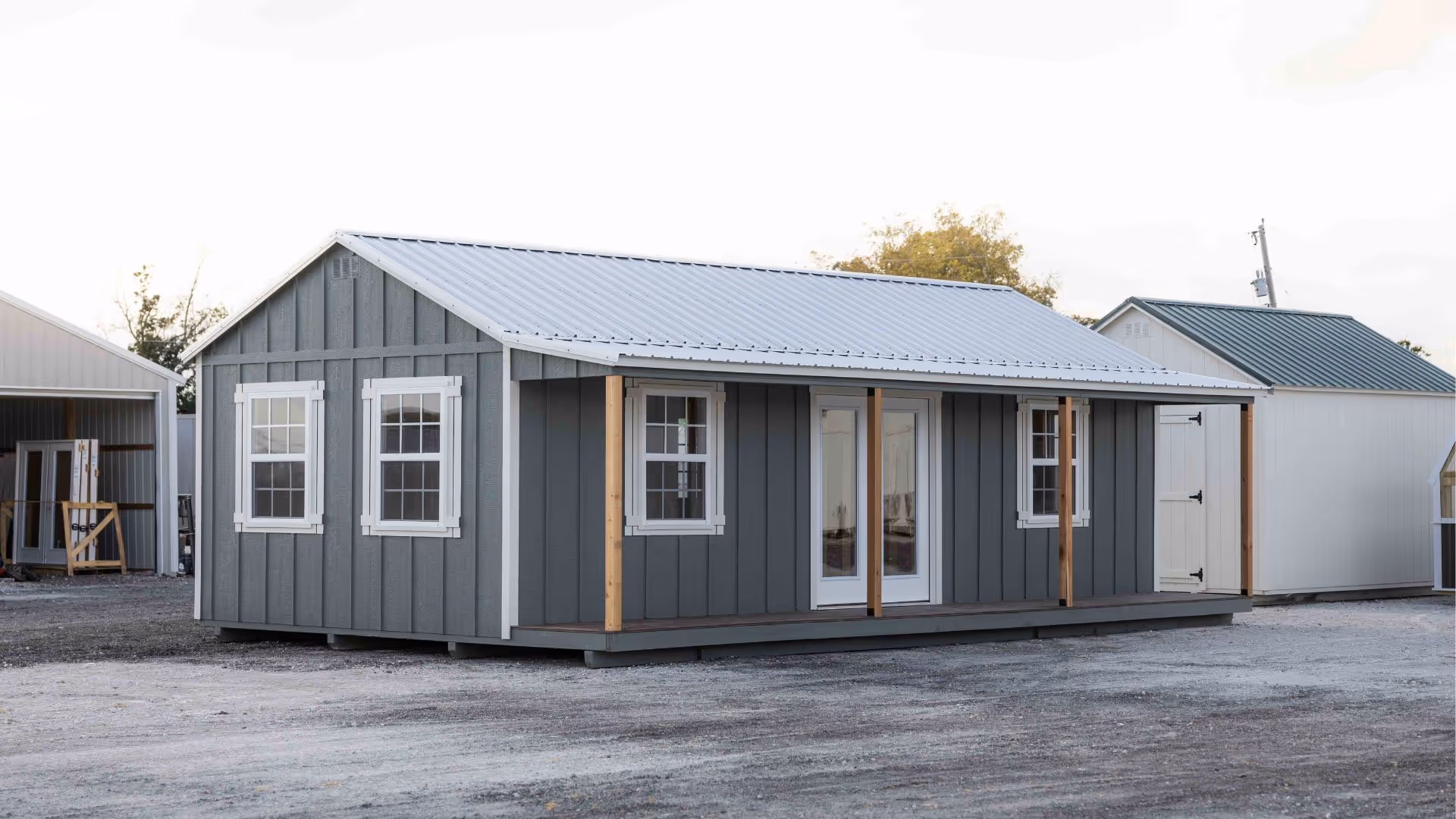This 18x32 gable cottage combines charm with functionality, perfect as a small one-bedroom retreat. Featuring a 14x32 interior with a 4x32 front porch, it’s finished with classic board and batten siding for added style. A centered French door at the front, flanked by 3x4 insulated windows, creates a bright and welcoming entry. Additional insulated windows and a 9-lite door at the back provide ample light and accessibility, making it an ideal choice for a cozy cottage or guest space.